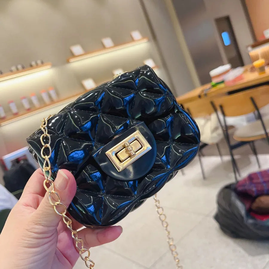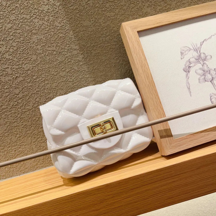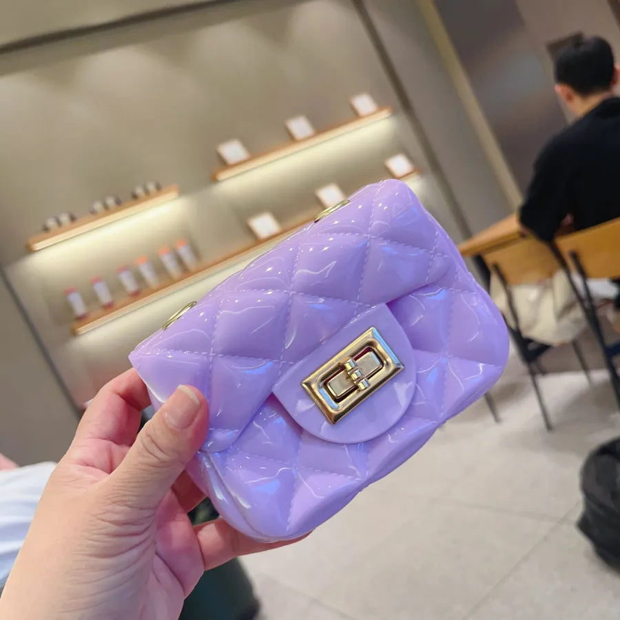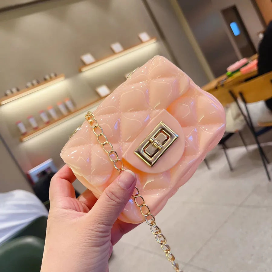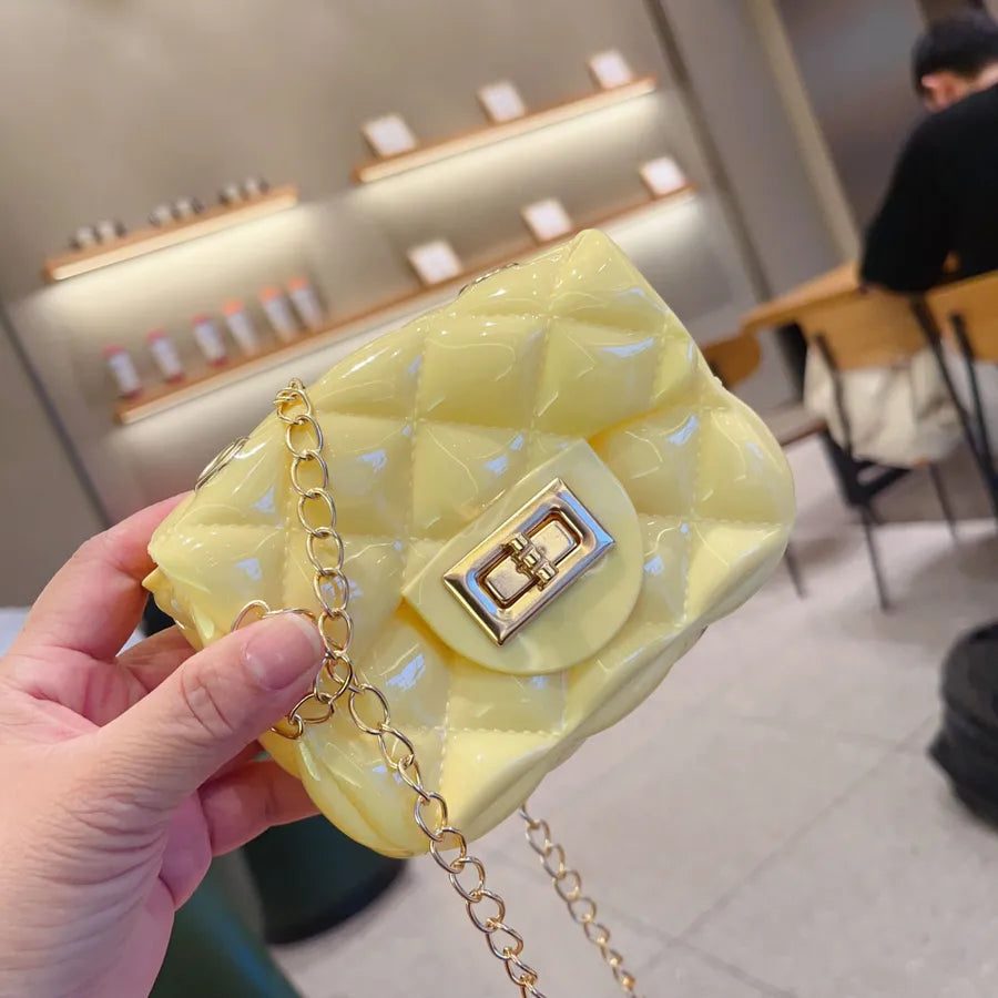 Women's Mini PVC Solid Color Lingge Cute Streetwear Square Flip Cover Lock clasp Jelly Bag