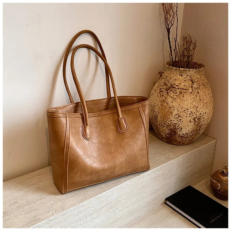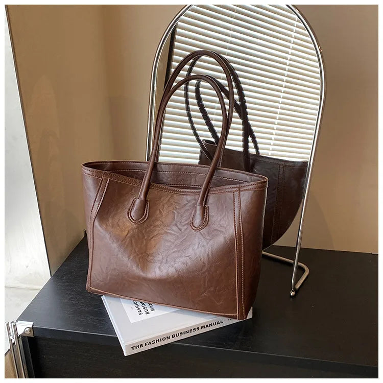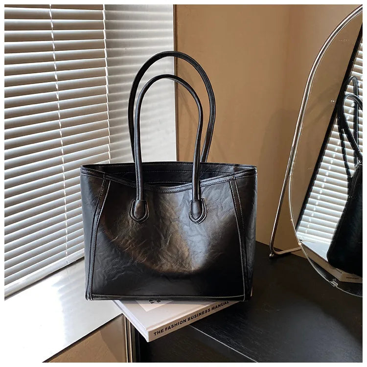 Women's Pu Leather Solid Color Basic Sewing Thread Square Zipper Shoulder Bag Tote Bag